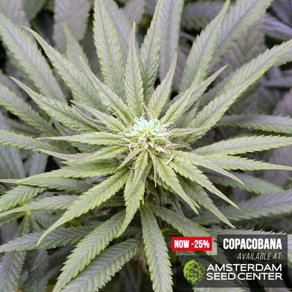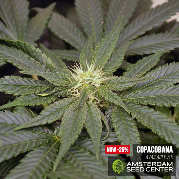 Copacabana only grows about 150cm high despite their pure Sativa genetics and therefore is also suitable for a great indoor grow. Her flowering period lasts 10-12 weeks, during which she´s creating long and resinous buds. Copacabana can be harvested at the end of October and she yields 600-800g per plant, indoor Copacabana produces about 550-600g per square meter.